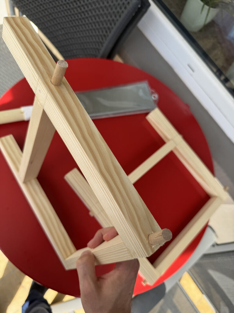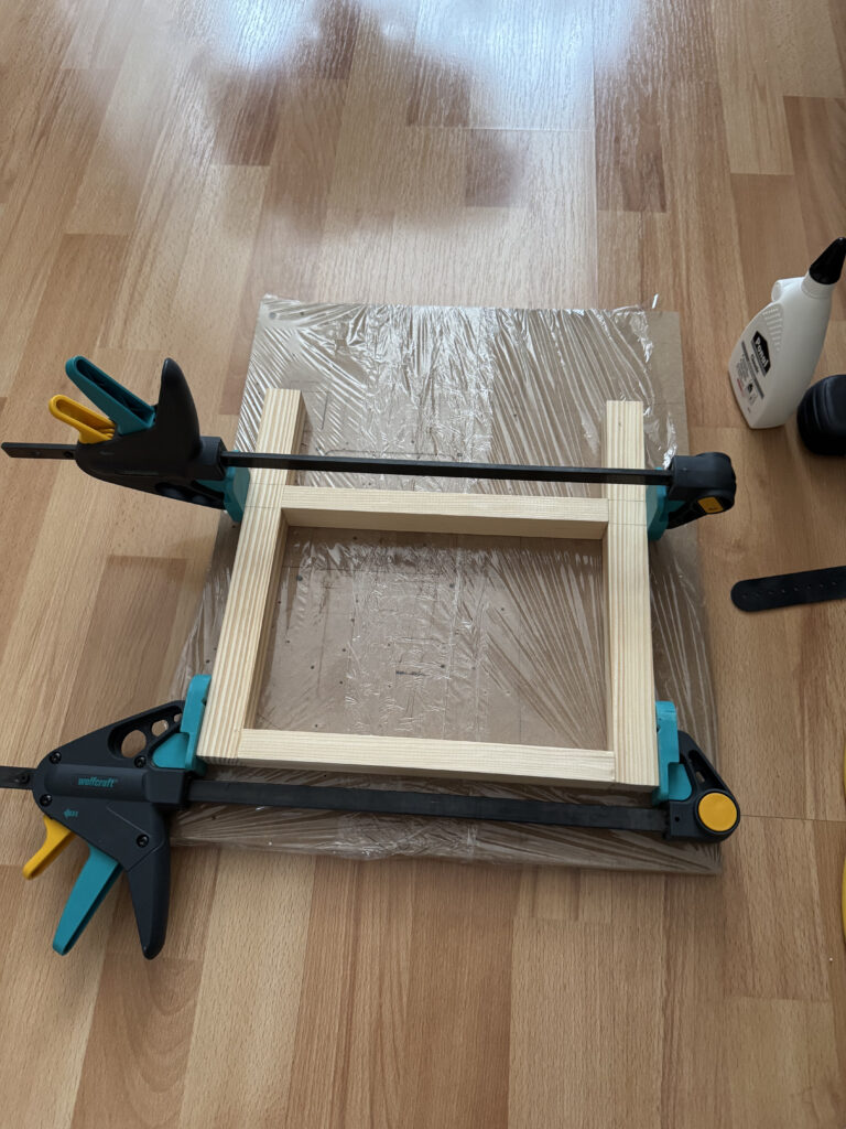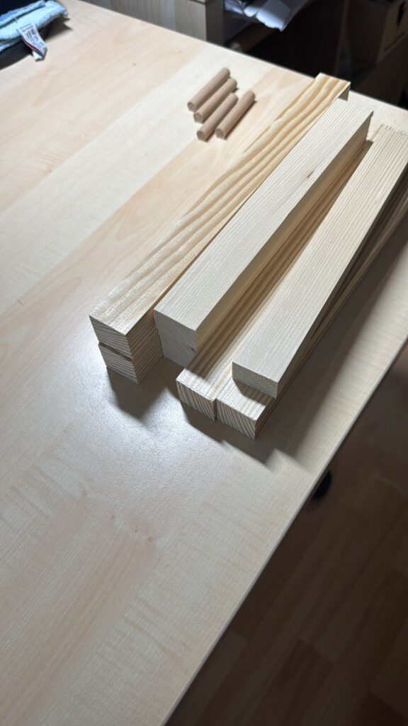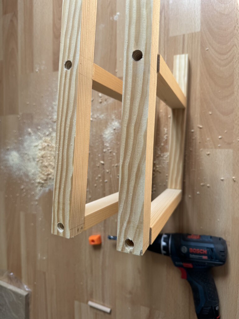 For some additional stability, I wanted to add dowels to the glue joints in the framing. For this I used a 3D-printed helper jig to drill centered and straight holes.