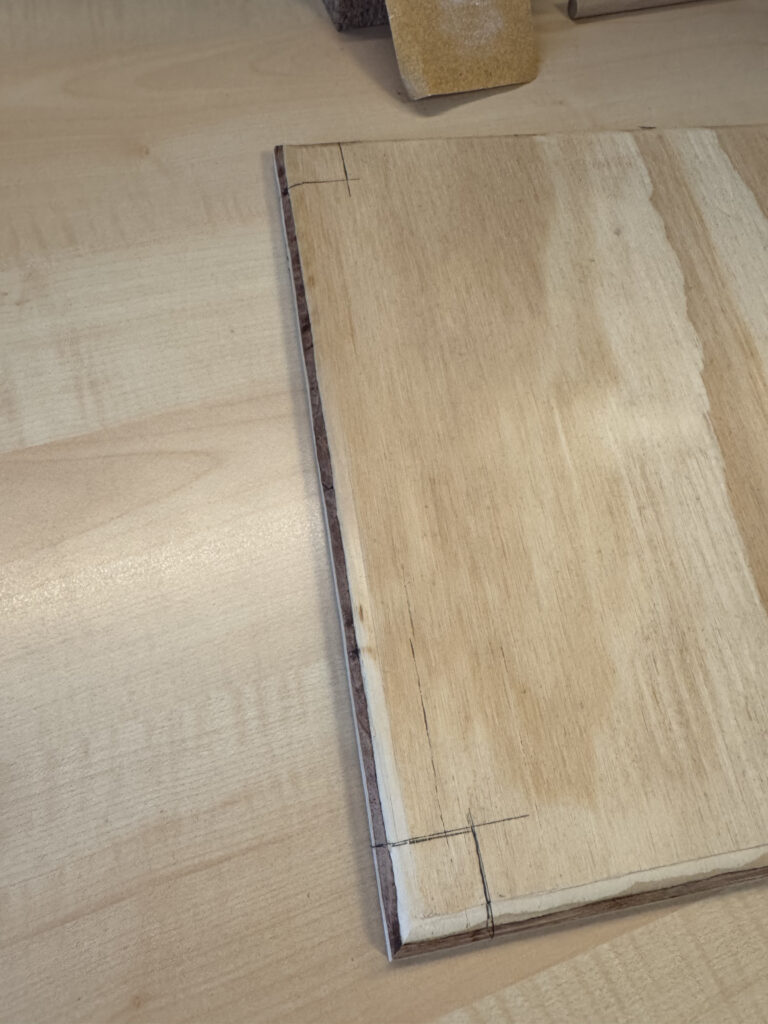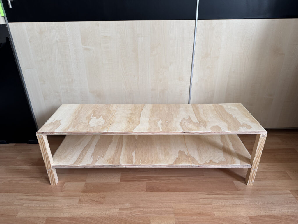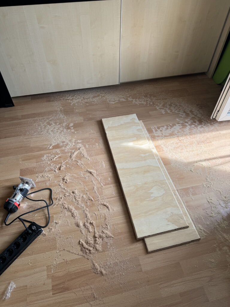 Thus the work could begin, but not before a trip to the hardware store and letting the raw materials collect dust under my bed for several months. The first step was to round the edges of two pieces of plywood using a router. The plywood was already cut to the right dimensions by the hardware store. Unfortunately, for the first attempt I used the cheapest set router bits I could find on Amazon, and the one I used promptly lost its guide bearing, causing me to create a rather big dent in one of the pieces (I was able to fix it up more or less with some additional sanding and hid the offending spot on the backside of the bottom shelf). I ordered new router bits from Aliexpress which were also rather cheap but of significantly better quality and was able to finish the job with those. Here is a picture of the aftermath (and, yes, for lack of a better workspace I did this in my apartment, please don’t tell my landlord).