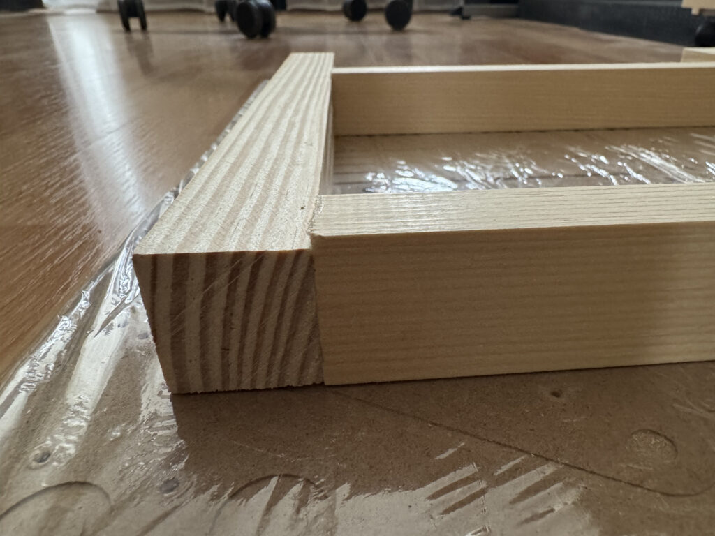 Next up was the framing, for which I cut some square stock to the correct dimensions using my Japanese saw and glued it in shape on a flat piece of MDF. I used two different kinds of stock, one square for the posts and one rectangular for the support boards. Unfortunately, I could not find them in the exactly right dimensions, and, since my apartment is not equipped with a table saw, there is a little bit of an overhang on the boards. I hid this overhang on the inside of the shelf.