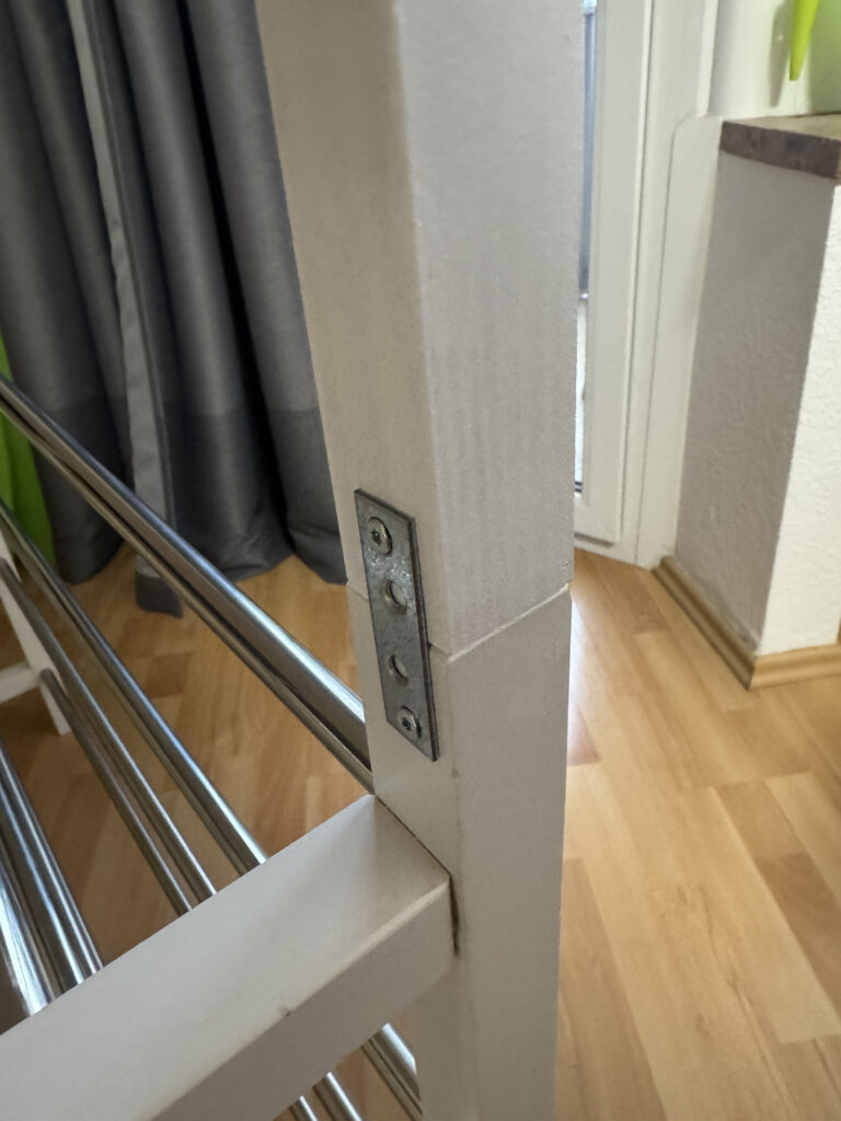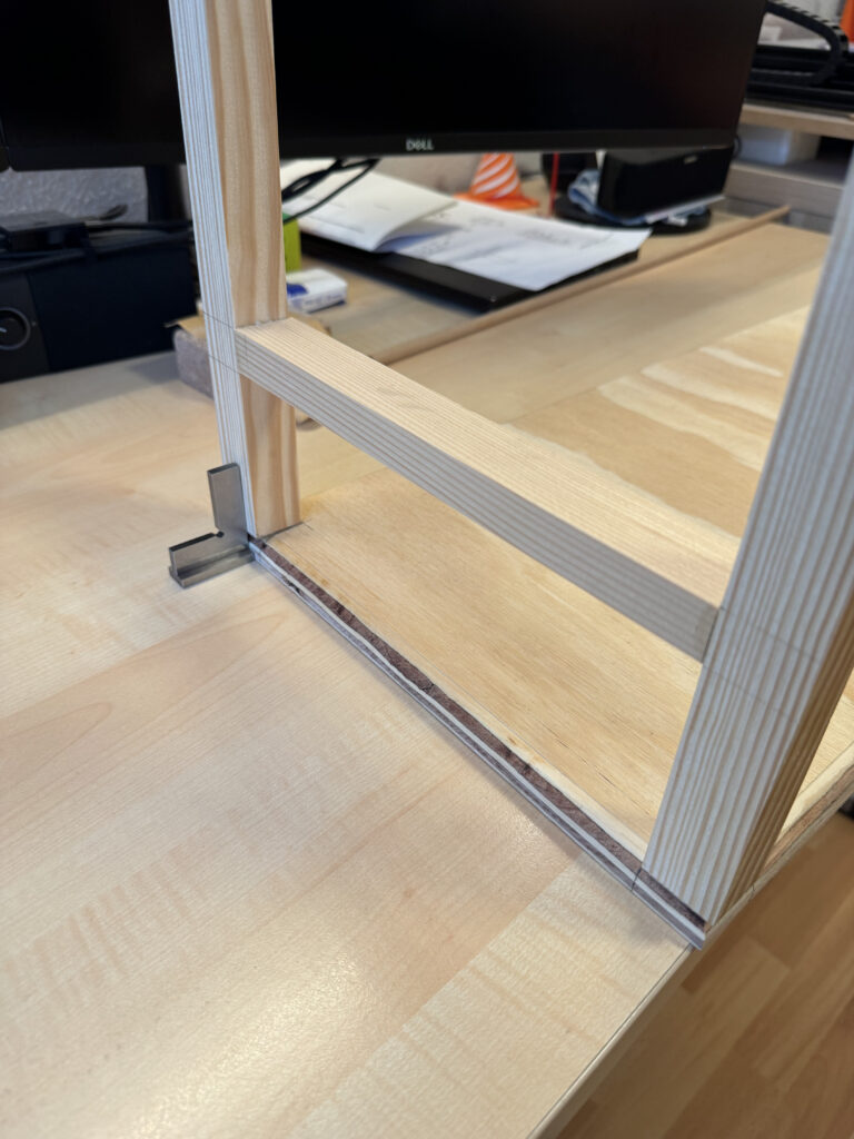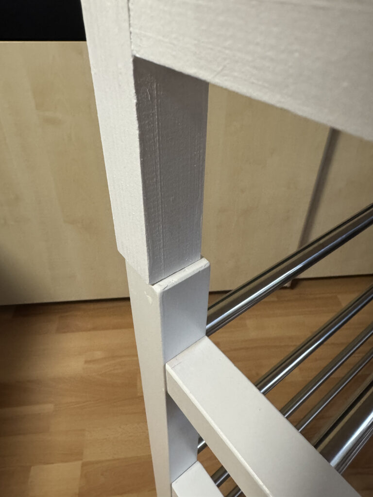 To attach it to the shoe rack I used some metal bracing. There were some alignment issues, because the shoe rack is not very high quality and not very accurately constructed, and I built my part according to the ideal dimensions (100cm x 30cm) and not to the actual dimensions. I am happy to report that my work is accurate to the millimeter. Also my posts are a couple millimeters smaller than the ones of the shoe rack causing additional alignment problems, since I wanted to put the metal bracing on the inside, which shifts everything over by the difference in size between the posts. In the end I made it work as best as I could and am fine with it.