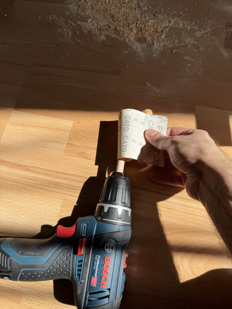 Since some of the dowels were a bit too large I put them in the drill to sand them. After gluing the dowels in place, I sawed off the extra bits.
