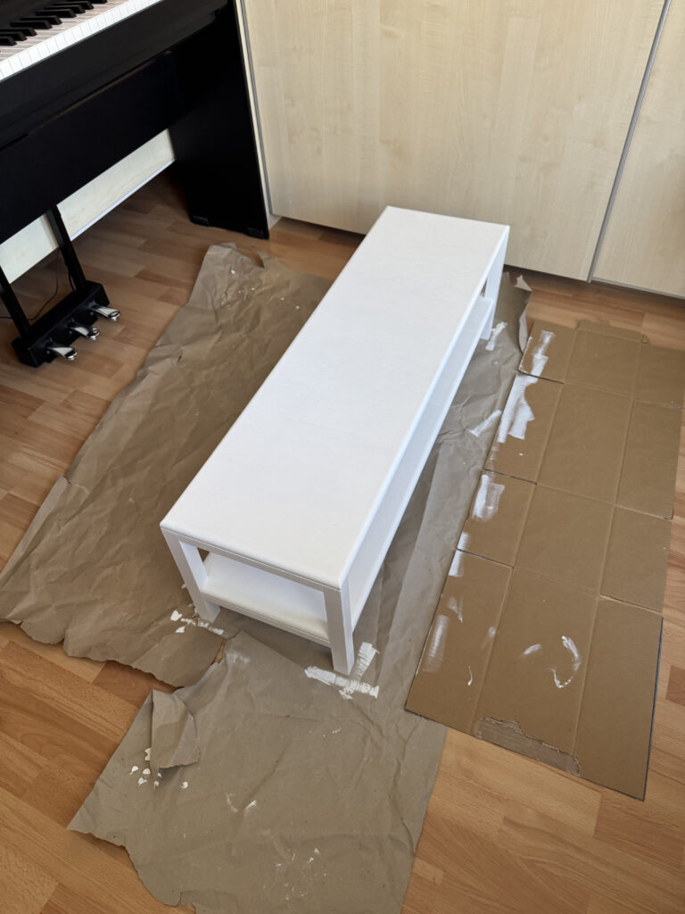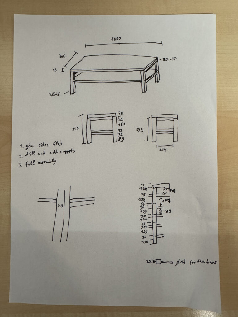 Measurements were taken from the shoe rack and while the rack used metal tubing I decided to go for a shelf made out of boards as I intend to use it for other things, which might be smaller than shoes and thus be susceptible to falling through such tubing structures. A plan was formulated in my mind and partially eternalized on a singular sheet of A4 paper.