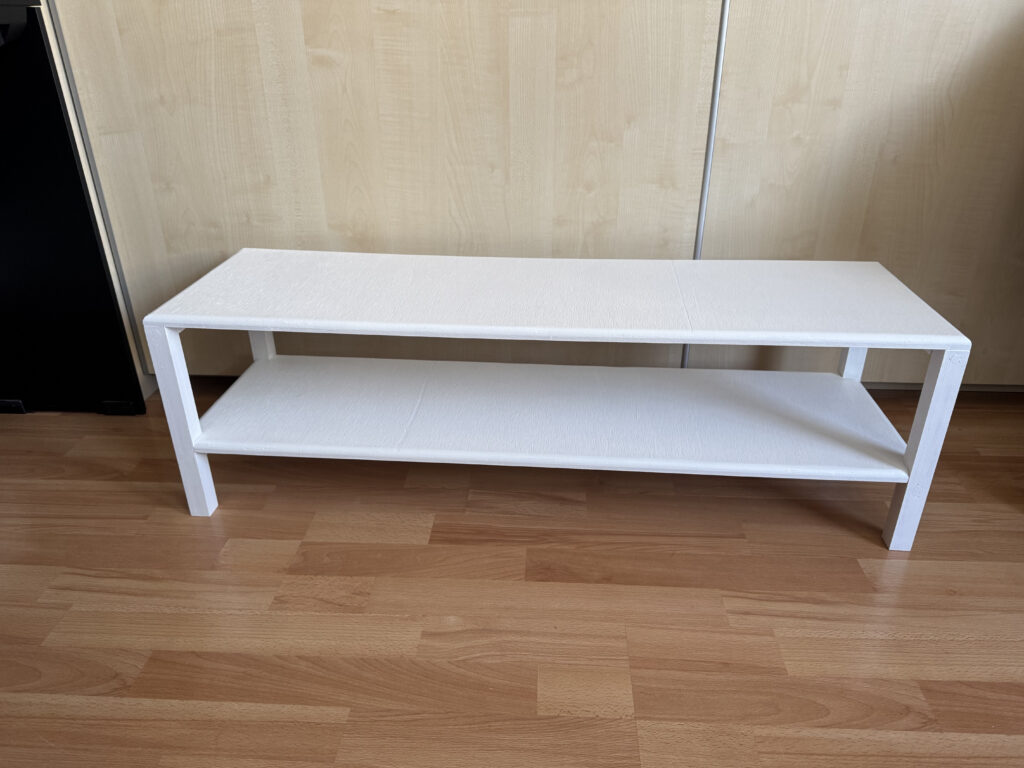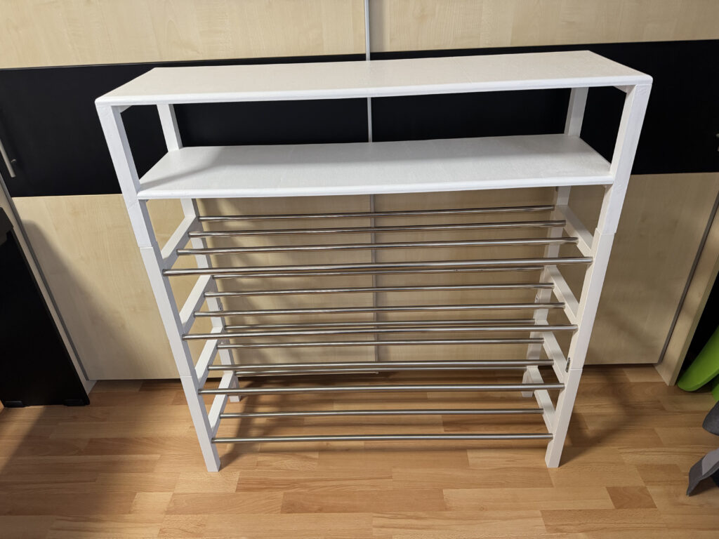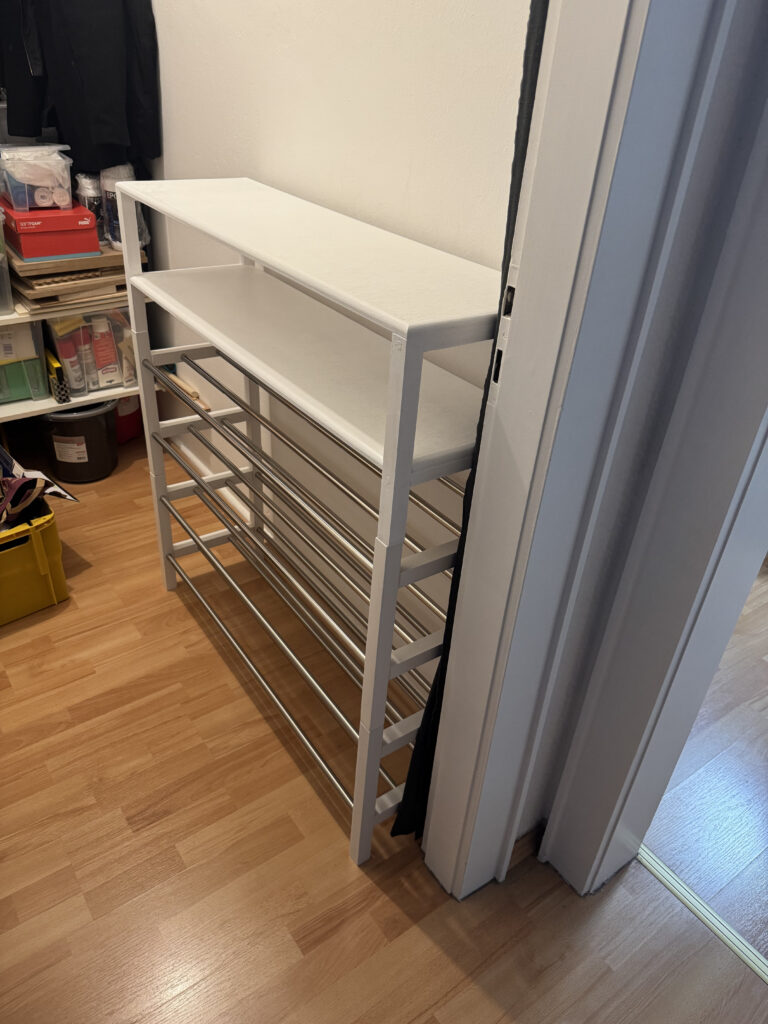 Seeking ever more usable surface area in my storage room, I set out to build an extension for the shoe rack that was already in place. My hobby woodworking adventures are documented in the following. But first I shall spoil you with a picture of the end result.