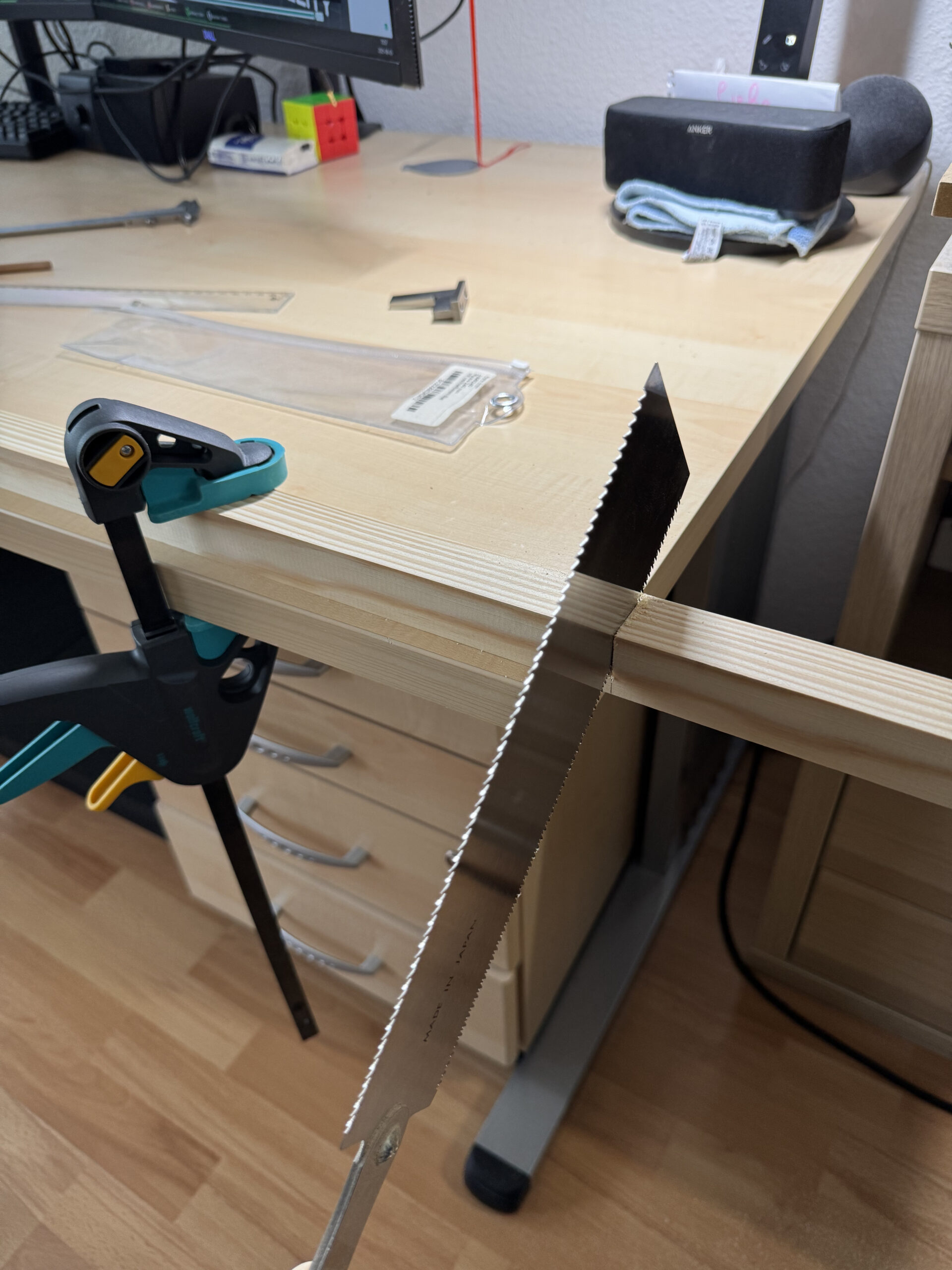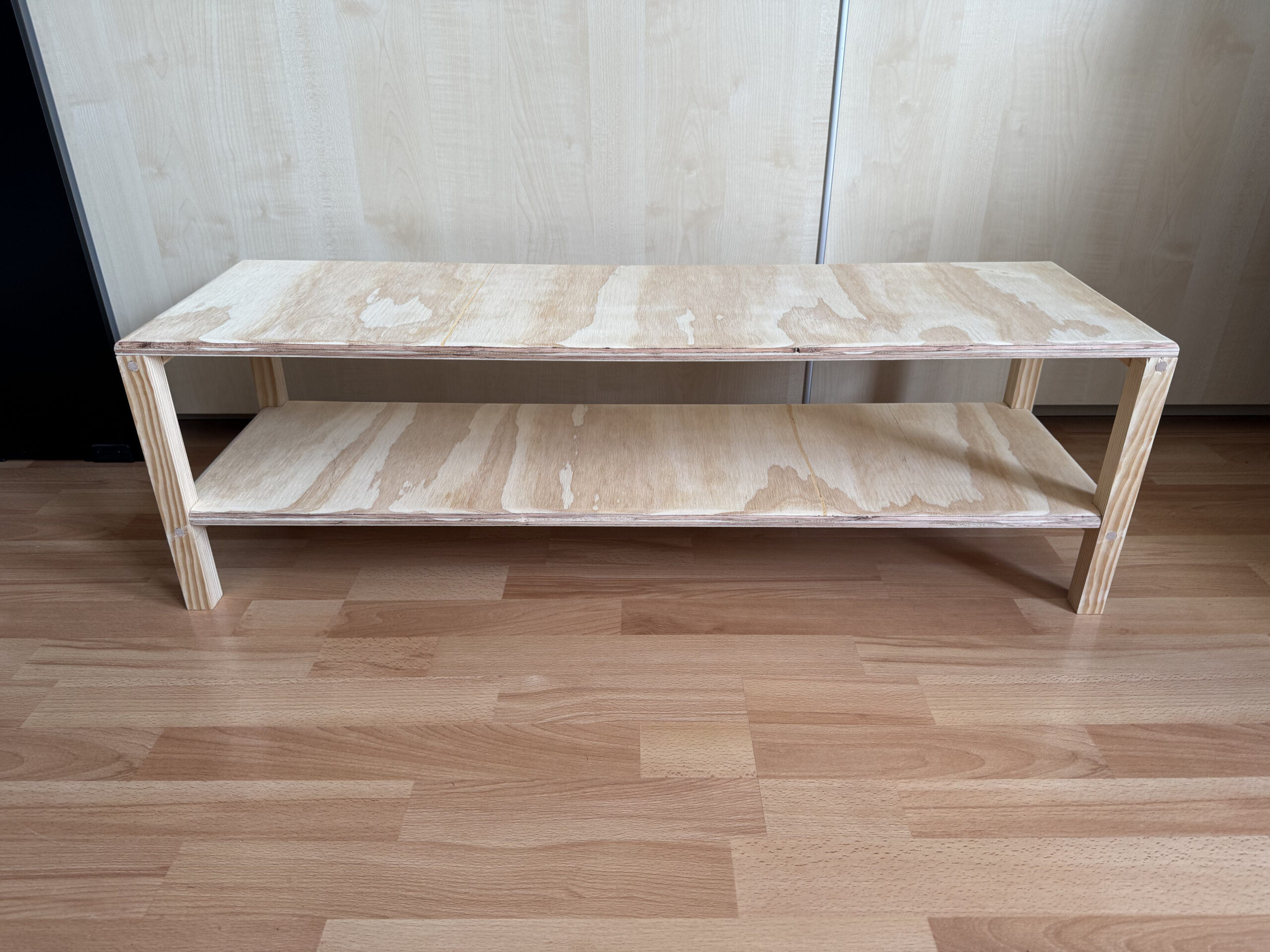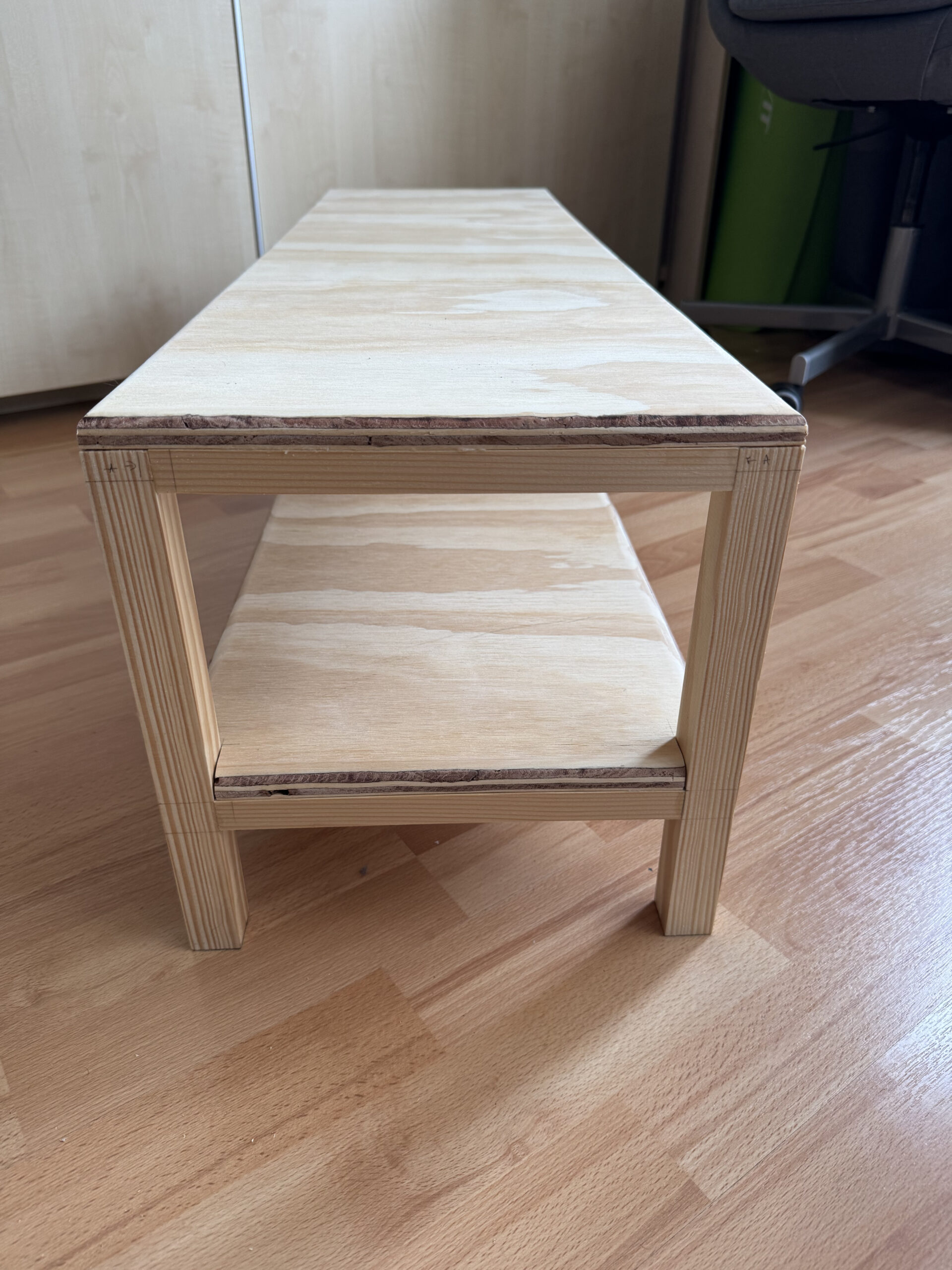Thus the work could begin, but not before a trip to the hardware store and letting the raw materials collect dust under my bed for several months. The first step was to round the edges of two pieces of plywood using a router. The plywood was already cut to the right dimensions by the hardware store. Unfortunately, for the first attempt I used the cheapest set router bits I could find on Amazon, and the one I used promptly lost its guide bearing, causing me to create a rather big dent in one of the pieces (I was able to fix it up more or less with some additional sanding and hid the offending spot on the backside of the bottom shelf). I ordered new router bits from Aliexpress which were also rather cheap but of significantly better quality and was able to finish the job with those. Here is a picture of the aftermath (and, yes, for lack of a better workspace I did this in my apartment, please don’t tell my landlord).