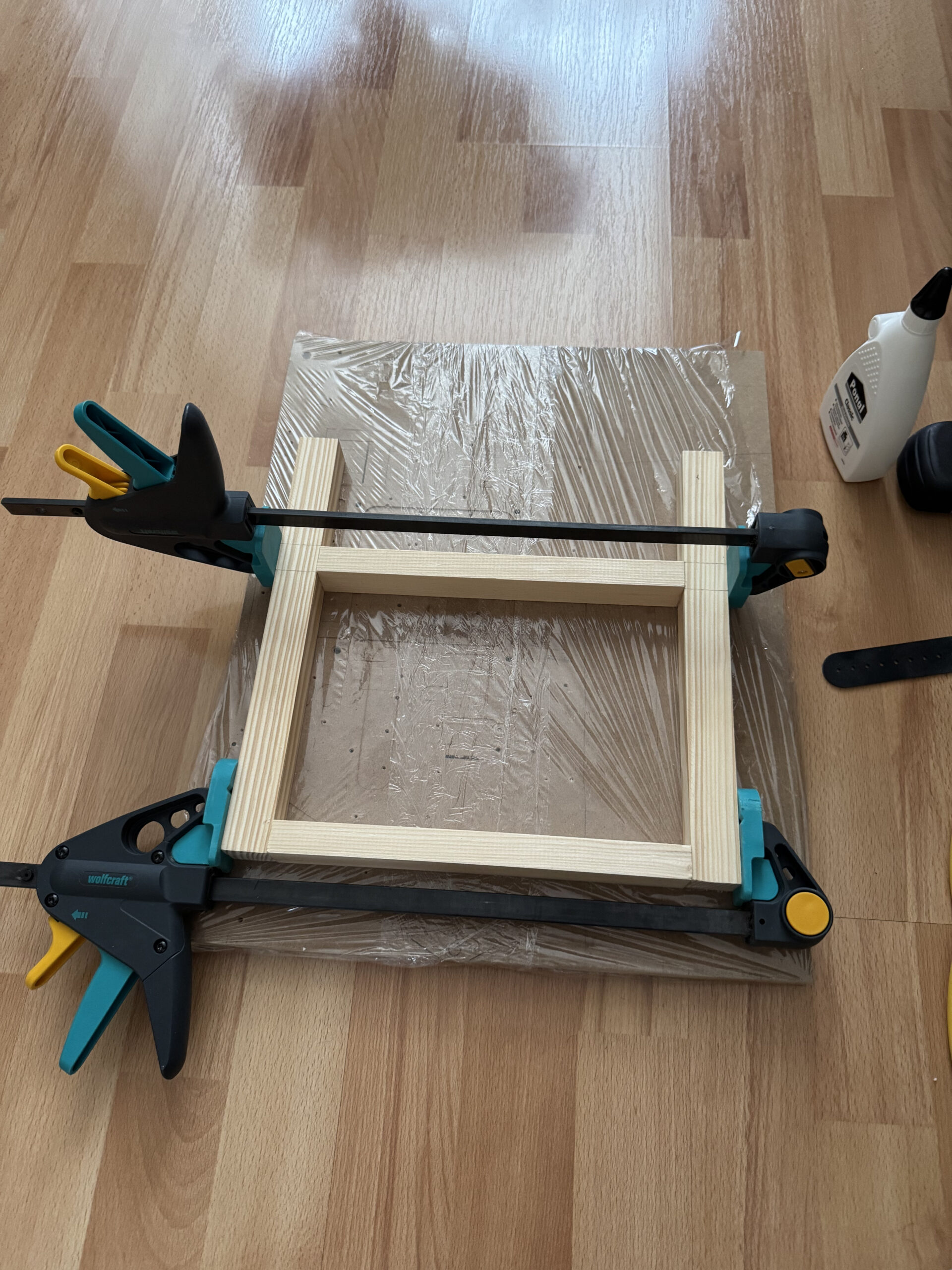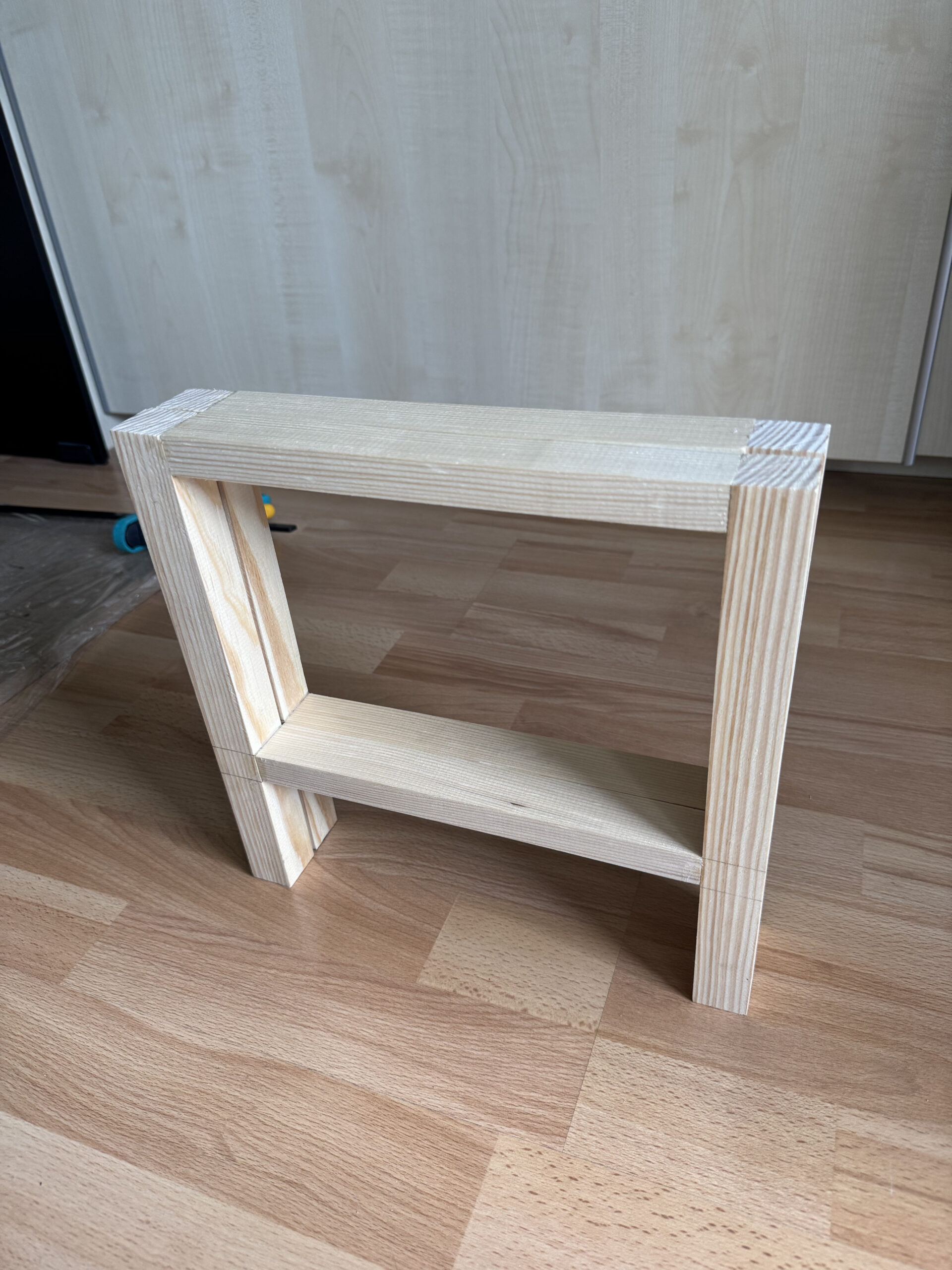Next up was the framing, for which I cut some square stock to the correct dimensions using my Japanese saw and glued it in shape on a flat piece of MDF. I used two different kinds of stock, one square for the posts and one rectangular for the support boards. Unfortunately, I could not find them in the exactly right dimensions, and, since my apartment is not equipped with a table saw, there is a little bit of an overhang on the boards. I hid this overhang on the inside of the shelf.