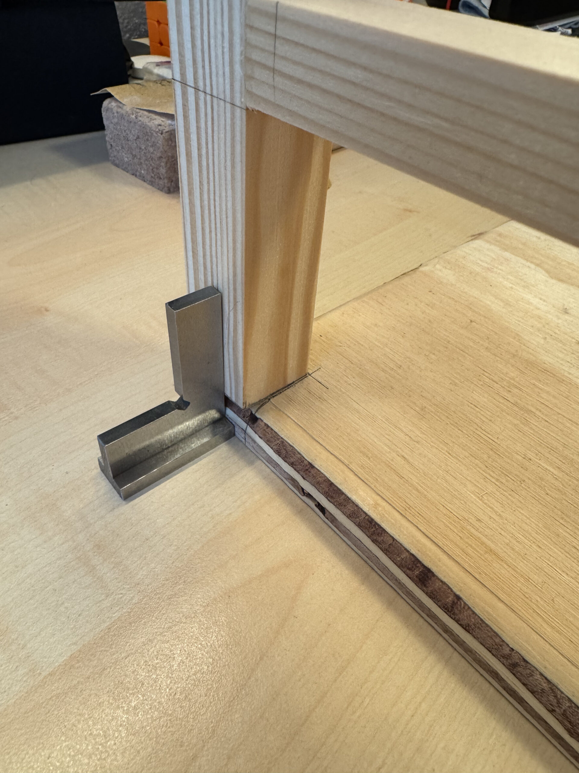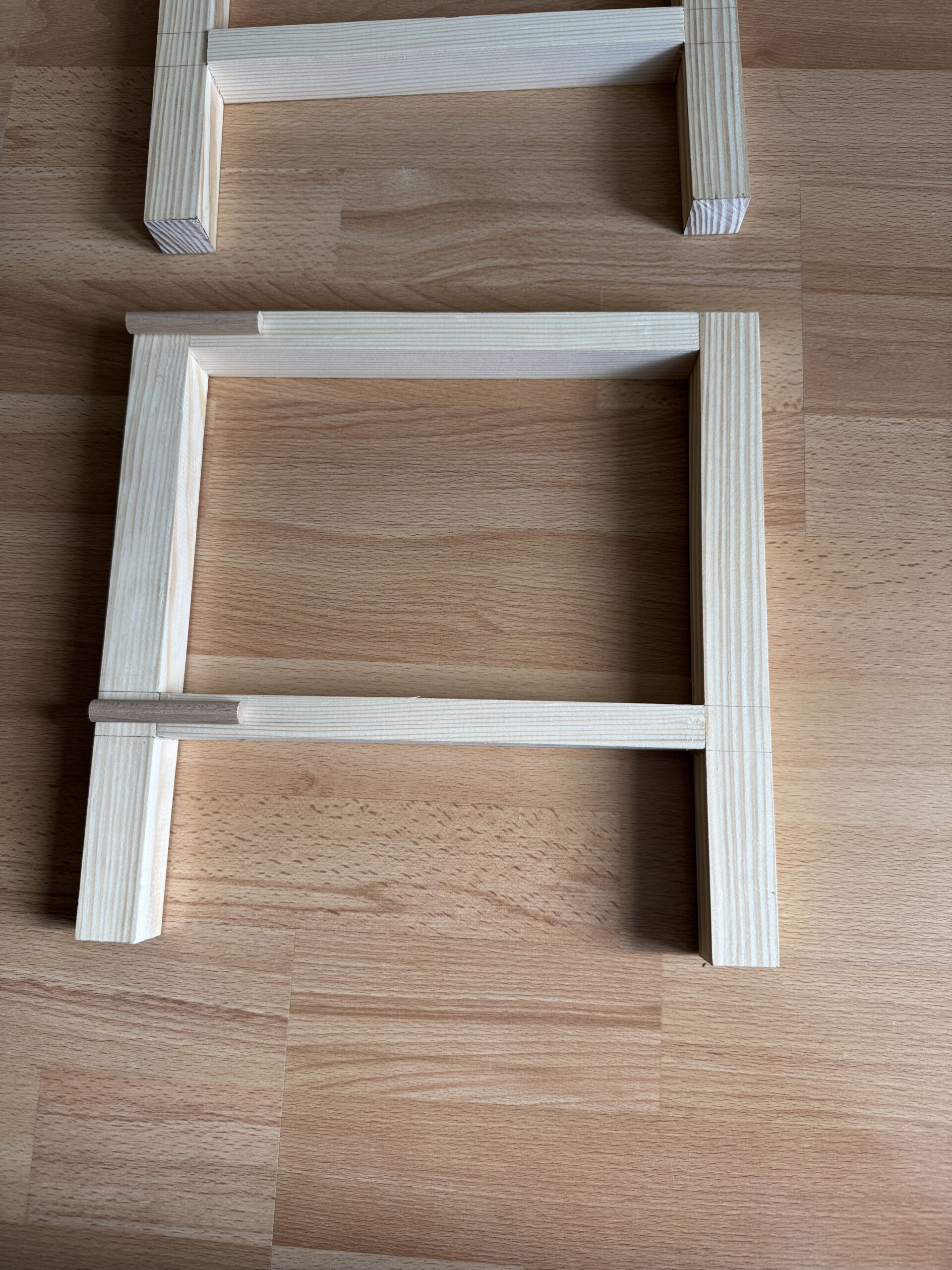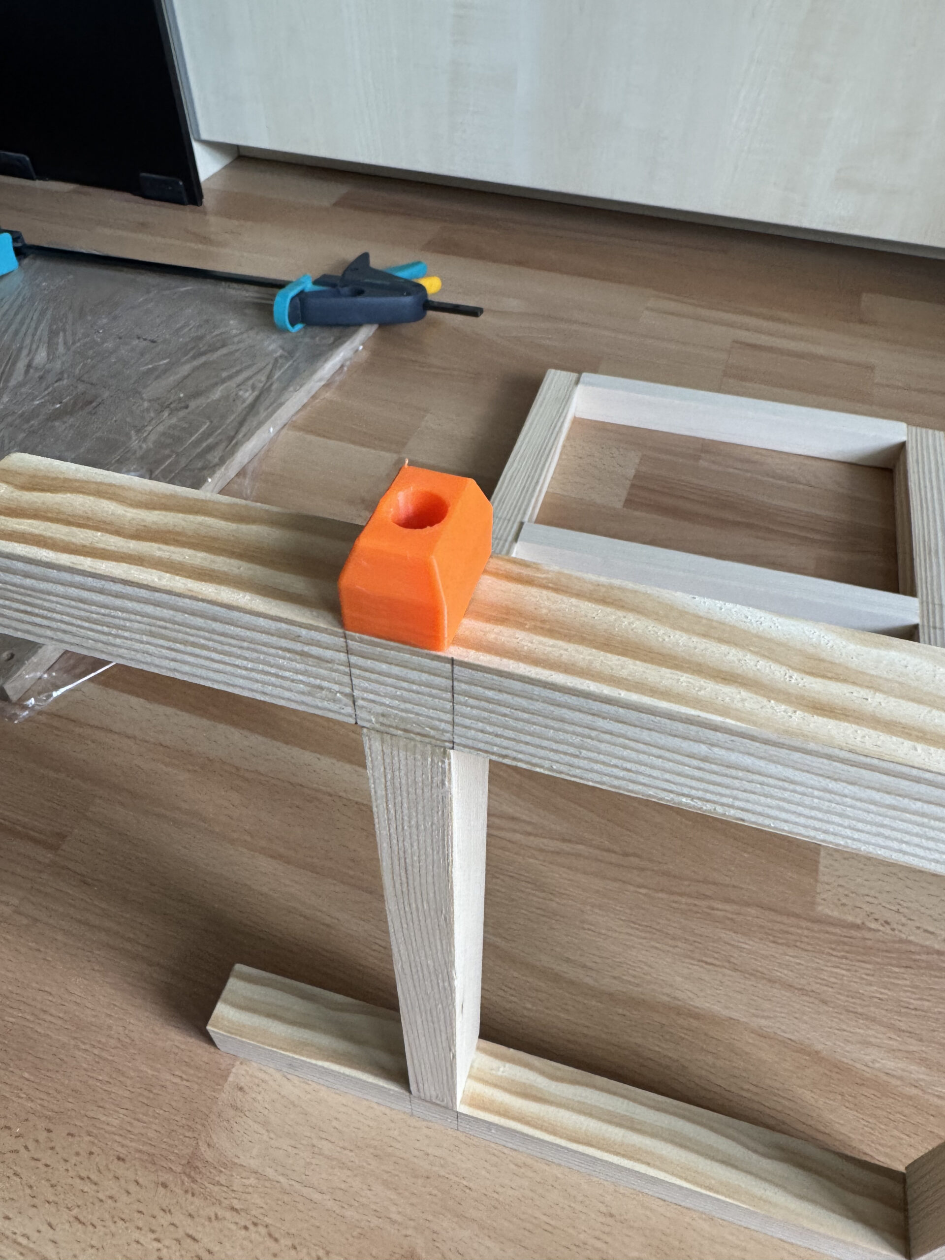 For some additional stability, I wanted to add dowels to the glue joints in the framing. For this I used a 3D-printed helper jig to drill centered and straight holes.